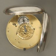 Silver verge fusee watch with date and excentric dial, 'grisaille' painted enamel. Diameter 58 mm