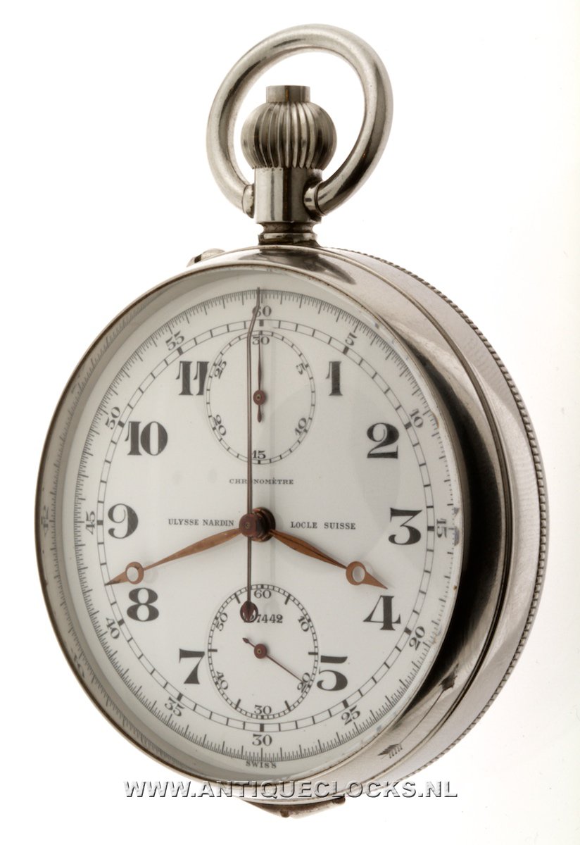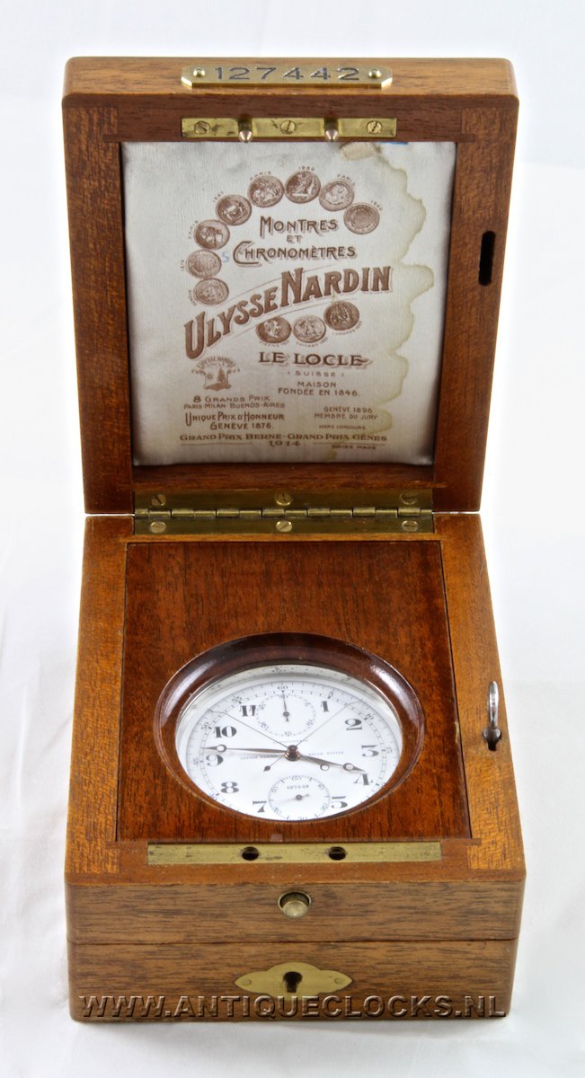 | SOLD | Ulysse Nardin chronometre rattrapante (split-second chronograph) 'deck watch' in original box. Serienummer 127442. Enamel dial writes: 'Ulysse Nardin Locle Suisse, Chronomètre, 127442'