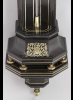 Ebony veneer with brass inlay, original console, brass adjustable plates, wooden mercury-reservoir. On top of the crest is a miter and a staff, indicating Plasson was an abbot. |